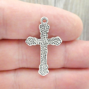 This crucifix cross charm is the perfect way to show your faith. Made from antique silver pewter, it features a beautiful cross with intricate details. You can wear it as a necklace or add it to your favorite bracelet. It makes a great gift for anyone who loves Jesus and wants to display their faith proudly. Height 34-mm, Width 19-mm, Depth 3-mm. This Pewter Charm Does Not Include a Jump Ring or Split Ring.