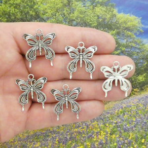 Add some whimsy to your wardrobe with this Filigree Butterfly Charm Pendant. The delicate butterfly is crafted from antique silver pewter and can be add to a chain or bracelet. Height 26-mm, Width 23-mm, Depth 3-mm. This Pewter Charm Does Not Include a Jump Ring or Split Ring.
