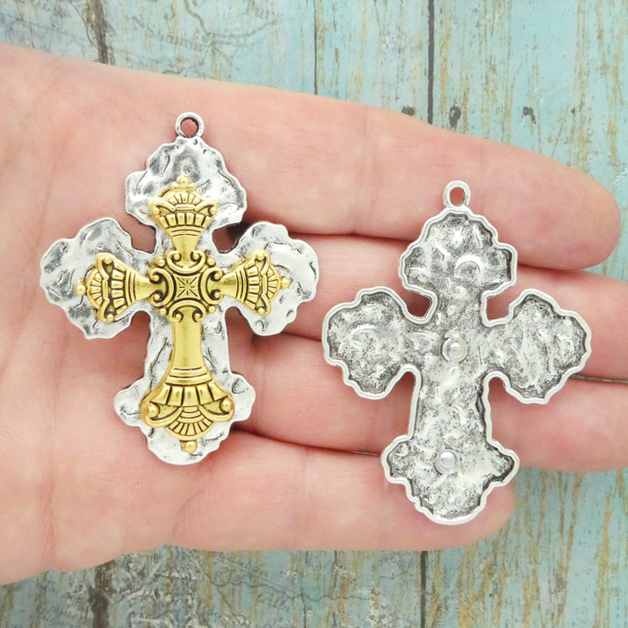 Dive into the timeless allure of our Hammered Cross Pendant, available in both silver and gold pewter finishes. Each pendant in this bulk collection is meticulously crafted to reflect a blend of rustic charm and enduring faith. Design: The cross features a distinctive hammered texture, giving it a unique, artisanal look that catches the light beautifully, adding depth and character to its surface. Material: Made from high-quality pewter, these pendants offer the appearance of precious metals at a fraction of the cost. The silver pewter variant boasts a cool, luminous sheen, while the gold pewter exudes warmth and richness. Versatility: Perfect for bulk purchases for events like weddings, or as part of religious education programs. They can be worn as standalone pendants or combined with other charms for a personalized look. This Hammered Cross Pendant is not just jewelry; it's a symbol of faith, a conversation starter, and a piece of wearable art that resonates with tradition and style. Ideal for those looking to gift something meaningful or to add a spiritual touch to their wardrobe. Height 59-mm, Width 46-mm, Depth 5-mm. This Pewter Pendant Does Not Include a Jump Ring or Split Ring.