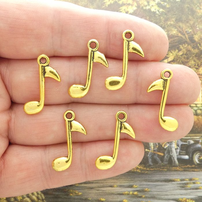 Raise your jewelry collection with this exquisite Gold Music Note Charm crafted from high-quality pewter. This charm features a detailed musical note design, capturing the essence of melody and rhythm. The charm has been coated with a lustrous gold finish, adding a touch of elegance and making it a perfect accessory for music lovers. Whether you're looking to add a personal touch to a bracelet, necklace, or earrings, this charm serves as a beautiful symbol of your passion for music. Its versatile size and classic design make it an ideal piece for both everyday wear and special occasions. Attach it to your favorite chain or incorporate it into a charm collection for a harmonious blend of style and sentiment. This Gold Music Note Charm in Pewter is not just an accessory, but a statement of your love for the universal language of music. Height 24-mm, Width 13-mm, Depth 2-mm. This Pewter Charm Does Not Include a Jump Ring or Split ring.