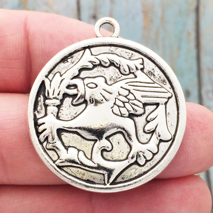 This exquisite pendant features the Disk Griffin, a mythical creature known for its majestic presence and symbolic power. Here's what makes this piece particularly captivating: Design: The pendant showcases a griffin, a legendary creature with the body, tail, and back legs of a lion, and the head, wings, and talons of an eagle. The griffin symbolizes strength, courage, and nobility, making it a powerful emblem in jewelry. Material: Crafted from antique pewter, this pendant exudes a timeless charm. Antique pewter gives it a vintage, almost mystical appearance, with a slight patina that enhances its depth and character. Finish: The finish on the antique pewter provides a subtle, aged look, with hints of oxidation that vary, making each piece unique. This finish not only adds to its aesthetic appeal but also ensures that the pendant feels cool and smooth to the touch. Detailing: The griffin is depicted in a dynamic pose, perhaps in flight or guarding, with intricate details that capture the texture of feathers and fur, adding to the realism and artistry of the piece. Versatility: This pendant can be worn with a variety of chains, from simple leather cords for a rustic look to more ornate silver for a touch of elegance. It's versatile enough for both casual and formal occasions. (Jump Ring not included) Symbolism: Beyond its aesthetic beauty, the griffin is often associated with guardianship, divine power, and the union of earth and sky, making this pendant not just a piece of jewelry but a talisman of sorts. This Disk Griffin Pendant in Antique Pewter is not just jewelry; it's a piece of art that carries with it the lore and legend of the griffin, making it a perfect gift for someone who appreciates mythology, fantasy, or simply unique, handcrafted jewelry. Height 38-mm, Width 34-mm, Depth 2-mm.