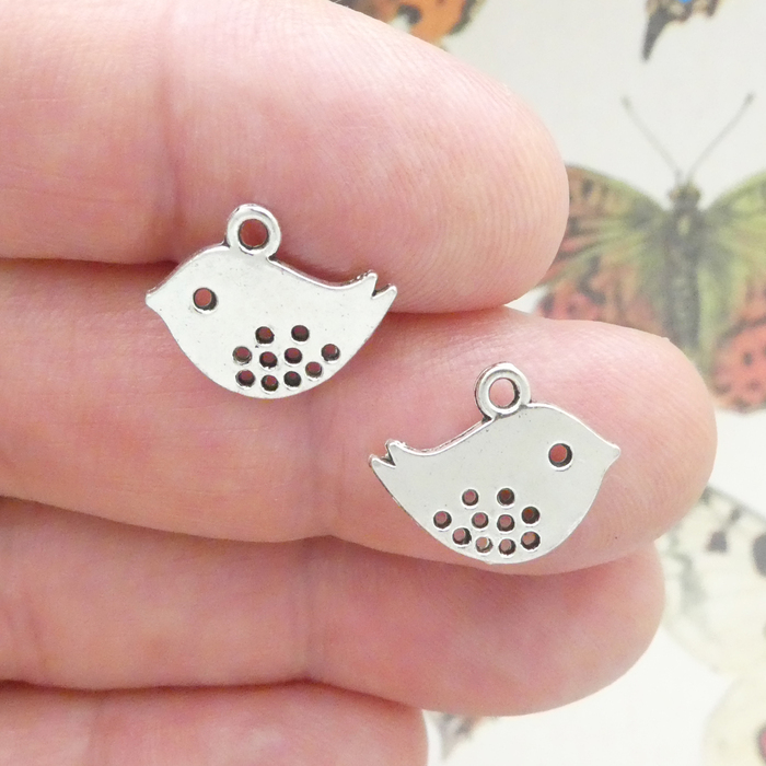 These Simple Bird Charms are perfect for creating unique jewelry pieces. Use them to add detail to charm bracelets, necklaces, earrings, and more. The charms are made of silver pewter beads and feature a simple design that is reversable. To use these charms, simply attach a jump ring or clasp onto the loop at the top of each charm and then string it onto your chain or cord. You can also use these charms with glue-on settings or wire wrapping techniques for even more creative designs. With these charms, you'll be able to create stunning one-of-a-kind jewelry pieces in no time! Height 13-mm, Width 16-mm, Depth 1-mm. This Pewter Charm Does Not Include a Jump Ring or Split Ring.