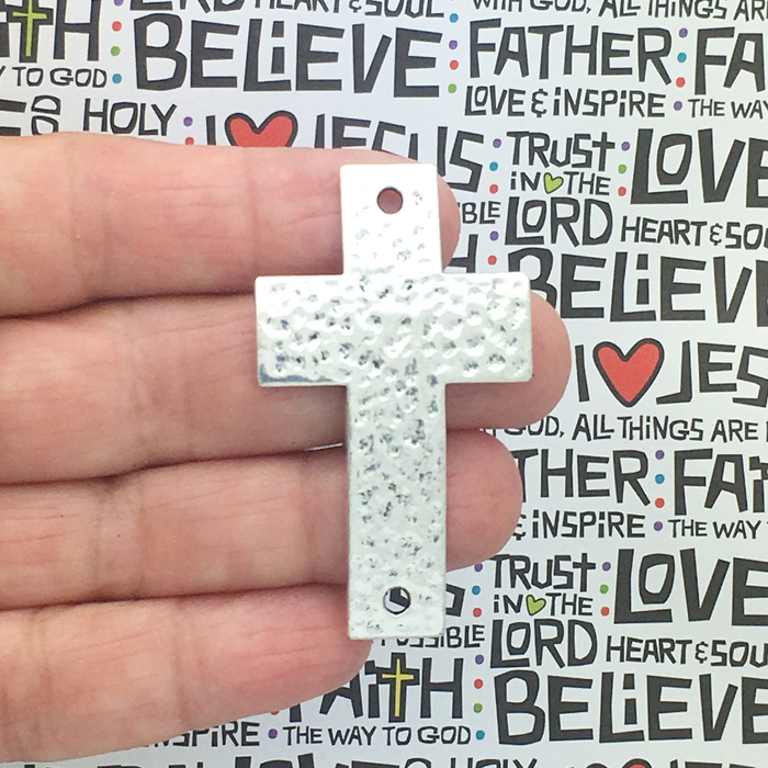 Use this Hammered Silver Cross Bracelet Connector as the focal point of your next hand crafted jewelry project. Height 29-mm, Width 50-mm, Depth 1-mm. This Pewter Charm Does Not Include a Jump Ring or Split Ring.