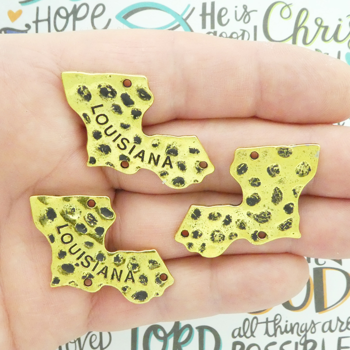 This Gold Pewter Medium Louisiana State charm has additional holes to attach other charms to. Louisiana is listed on the charm and the charm is shaped like the state. Height 29-mm, Width 36-mm, Depth 2-mm. This Pewter Charm Does Not Include a Jump Ring or Split Ring.
