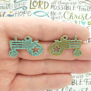 Medium sized Southwest Tractor Charm in Bronze Pewter with Turquoise Oxidation. This charm has a unique antique look. It makes the perfect addition to any southwestern Farm jewelry creation you can make. Height 21-mm, Width 30-mm, Depth 2-mm.