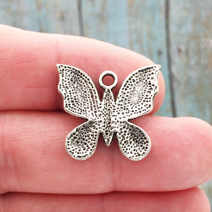 The Silver Butterfly Charms Wholesale Pewter with Crystal Accents are a beautiful addition to any jewelry collection. These charms can be used to create a variety of different jewelry items, such as bracelets, necklaces, earrings, and even keychains. To use these charms, first decide on the jewelry item you would like to create. If you're making a bracelet, you'll need to gather the necessary materials such as jump rings, a clasp, and a chain. If you're making earrings, you'll need earring hooks or fishhooks. Once you have all the materials, you can start attaching the charms to your chosen accessory. The Silver Butterfly Charms Wholesale Pewter with Crystal Accents have a small loop at the top of the charm, which can be easily attached to jump rings or hooks. Be sure to handle the charms carefully, as they are delicate and the crystals can be easily scratched or damaged. Once you have attached all the charms to your chosen accessory, you can then add any additional beads or crystals, if desired. You can also add any other embellishments or decorations to make the piece unique and personalized. It's also important to note that these charms are made of pewter, so it's important to take care of them to prevent tarnishing. To clean them, use a soft cloth and gently wipe down the charms. Avoid using any harsh chemicals or abrasive materials, as they can damage the pewter. It's also important to store the charms in a cool, dry place and to keep them away from moisture, as moisture can cause the pewter to tarnish. In conclusion, the Silver Butterfly Charms Wholesale Pewter with Crystal Accents are a great way to add a touch of elegance and beauty to any jewelry item. With proper care and handling, these charms will last for many years to come, and will be a cherished part of your jewelry collection. Height 22-mm, Width 24-mm, Depth 3-mm. This Pewter Charm Does Not Include a Jump Ring or Split Ring