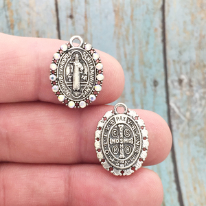 Small Double Sided St. Benedict Medal with bezel of AB Crystals In Antique Silver Pewter. Jubilee Medal with Cross. Earring Size. Height 21-mm, Width 16-mm, Depth 3-mm. This Pewter Charm Does Not Include a Jump Ring or Split Ring.