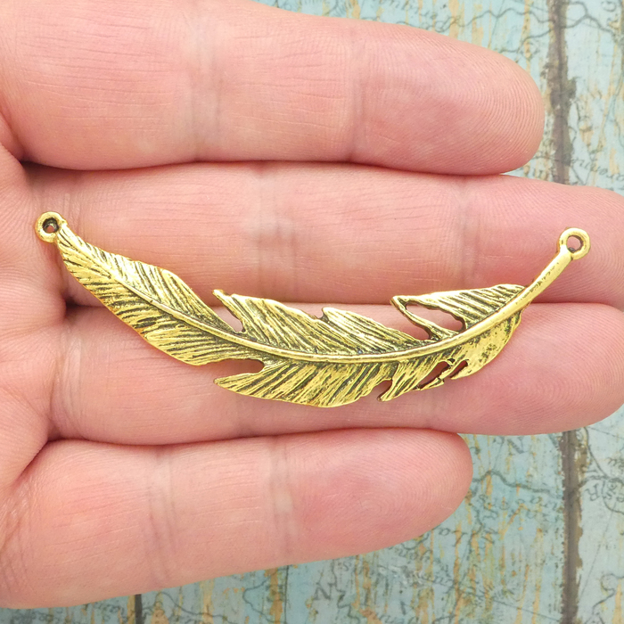 Large Feather Connector in Gold Pewter. Height 12-mm, Width 71-mm, Depth 3-mm. This Pewter Charm Does Not Include a Jump Ring or Split Ring.