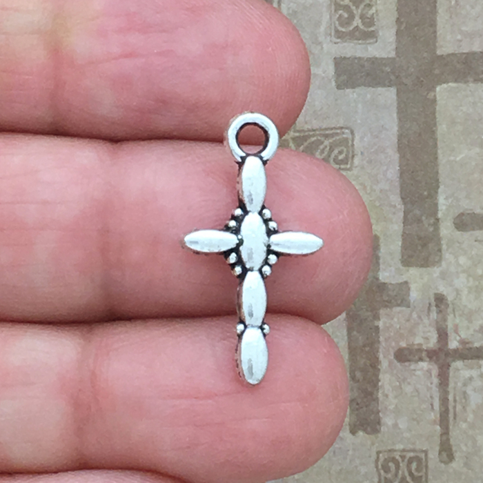 This modern Oval, rice shaped, bead cross made of pewter is perfect size for earrings, charm, necklace or any project you can come up with Double Sided. Height 23-mm, Width 12-mm, Depth 3-mm. This Pewter Charm Does Not Include a Jump Ring or Split Ring.