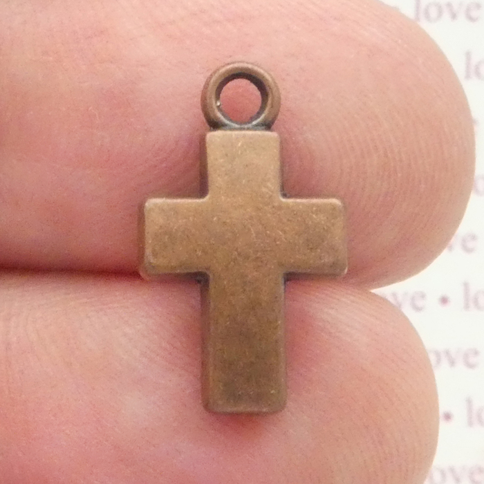 Double Sided Small Plain Copper Cross Charm. Also available in Silver and Bronze, Height 17-mm, Width 10-mm, Depth 3-mm. This Pewter Charm Does Not Include a Jump Ring or Split Ring.