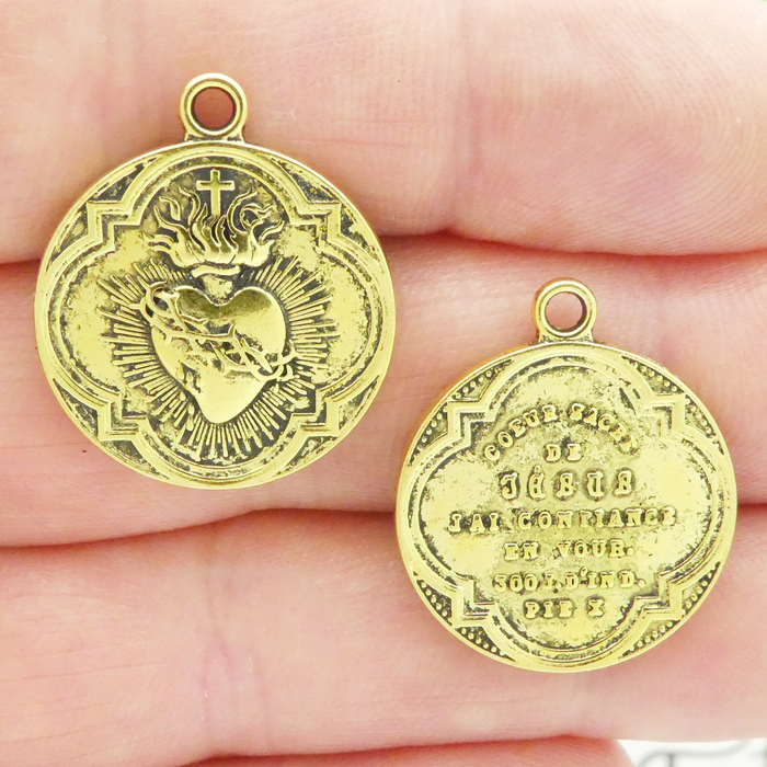 Express Your Faith with Gold Sacred Heart Charms Wholesale in Pewter Gold Sacred Heart Charms Wholesale in Pewter are the perfect way to express your faith in a creative and stylish way. These pewter charms feature a stunning gold-plated finish and a detailed depiction of the Sacred Heart of Jesus, making them an excellent choice for any religious jewelry project. The charms can be used to create necklaces, bracelets, earrings, and more. They are also great for making rosaries and other religious jewelry. To use the Gold Sacred Heart Charms Wholesale in Pewter, start by selecting the charm you need for your project. Once you have chosen, you can attach the charm to your jewelry piece using jump rings, clasps, or other jewelry-making findings (all sold separately). If you are making a necklace or bracelet, use a jump ring to attach the charm to a chain or cord. For earrings, use an earring hook or post to attach the charm. You can also use glue or epoxy to attach the charm to a flat surface. The Gold Sacred Heart Charms Wholesale in Pewter are an excellent choice for any religious jewelry project. They are made from high-quality pewter with a beautiful antique gold-plated finish, and they feature an intricate and detailed depiction of the Sacred Heart of Jesus. Whether you are making necklaces, bracelets, earrings, rosaries, or other religious jewelry pieces, these charms are sure to add a special touch to your project. Height 25-mm, Width 21-mm, Depth 2-mm. This Pewter Charm Does Not Include a Jump Ring or Split Ring.