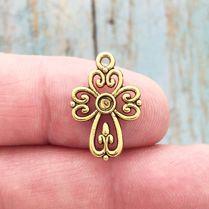 Add a touch of timeless elegance to your jewelry collection with this exquisite Small Gold Cross Charm in pewter! This charming little cross is crafted in antique gold and pewter, giving it a vintage look that will complement any style. Its intricate detailing antique finish give it a classic, timeless look that will stand out in any jewelry piece. Whether you're wearing it on a necklace, bracelet, or even as a keychain charm, this cross charm is sure to make a statement. Chain not included. Height 22-mm, Width 14-mm, Depth 2-mm. This Pewter Charm Does Not Include a Jump Ring or Split Ring.