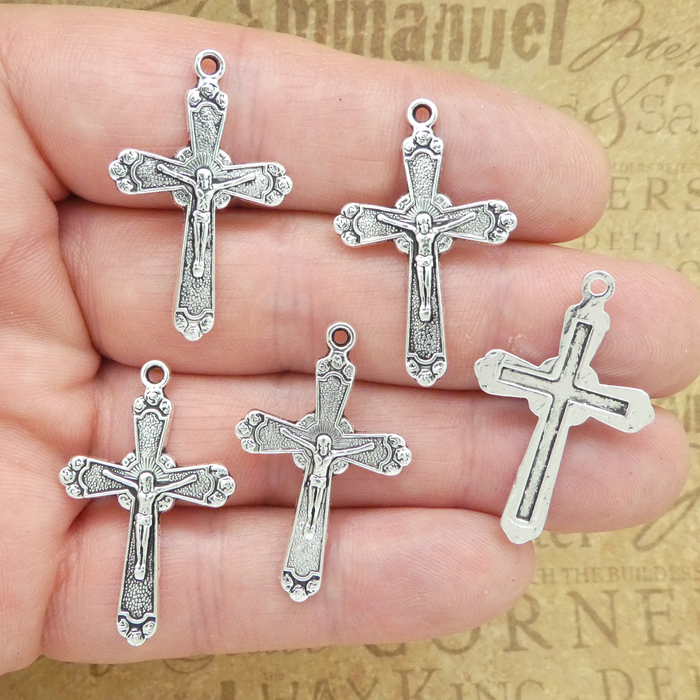 This crucifix cross charm is the perfect addition to any charm bracelet or necklace. Made from antique silver pewter, this charm is a beautiful way to show your faith. The antique silver finish gives it a rustic look that is perfect for any outfit. Height 34-mm, Width 19-mm, Depth 3-mm. This Pewter Charm Does Not Include a Jump Ring or Split Ring.