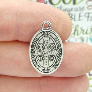 This beautiful Silver St Benedict Charm Medal can be worn as a necklace or attached to a charm bracelet. It is a great way to show your faith and to keep the Saint Benedict medal close to your heart. The Saint Benedict medal is a powerful symbol of protection and is known as the "Devil-chasing" medal. It is believed to offer protection against evil, poison, and disease. The medal is also a reminder to live a good and holy life. The Saint Benedict medal is a beautiful and meaningful way to show your faith. Height 25-mm, Width 16-mm, Depth 2-mm. This Pewter Charm Does Not Include a Jump Ring or Split Ring.
