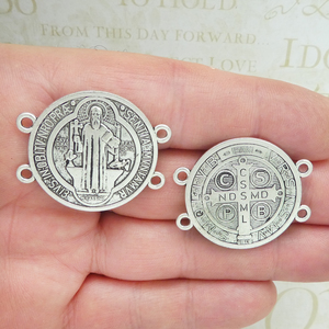 Saint Benedict Christian Religious Bracelet Connector in Antique Silver Pewter. Height 30-mm, Width 36-mm, Depth 2-mm. This Pewter Charm Does Not Include a Jump Ring or Split Ring.