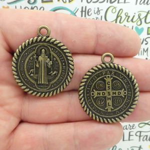 Double Sided St. Benedict Medal in Antique Bronze Pewter. Jubilee Medal on one side and a Cross (PAX) on other side. The St. Benedict Medal Bulk in Bronze Pewter is a beautiful way to show your support for the monks of Saint Benedict. This medal is made from bronze plated pewter. The St. Benedict Medal Bulk in Bronze Pewter makes an excellent gift for anyone who loves monastic life or Catholic faith. Height 36-mm, Width 31-mm, Depth 3-mm. This Pewter Charm Does Not Include a Jump Ring or Split Ring.