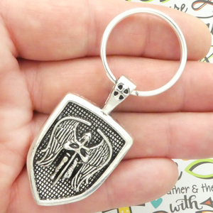 Archangel St Michael Keychain Silver Pewter Large Two Sided, Religious Medal Shield in Silver Pewter showing Archangel St Michael Protect Us on one side and The Archangel Shield on the other side. St Michael the Archangel is the patron saint of soldiers, doctors, and police. He is the protector of grocers, mariners, paratroopers, and the sick. September 29 is his celebration date. Pendant Height 52-mm, Width 29-mm, Depth 9-mm. Total Size Height 78-mm, Width 30-mm, Depth 9-mm.