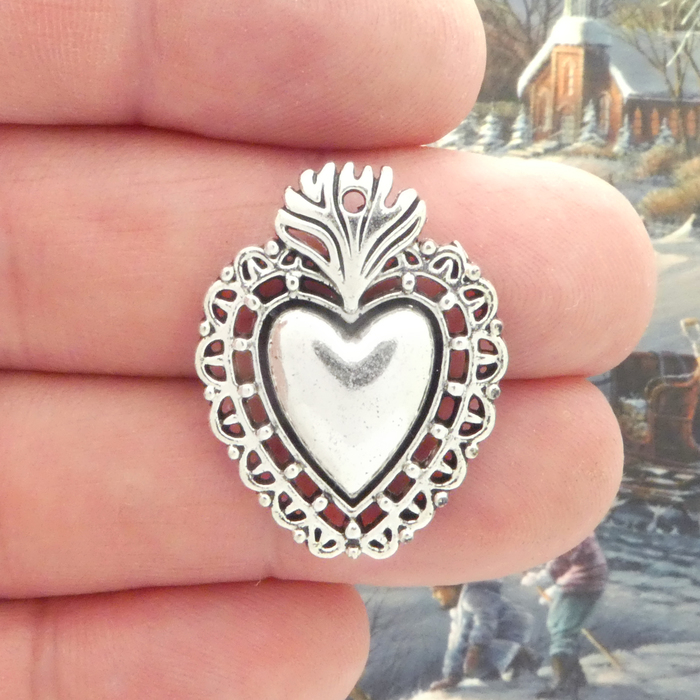 Sacred Heart of Jesus medals in silver pewter are a popular item among Catholics as a symbol of devotion to Jesus Christ. These medals typically feature an image of the Sacred Heart of Jesus, which is a representation of Jesus' physical heart as a symbol of his divine love for humanity. The Sacred Heart of Jesus is usually depicted as a flaming heart, and sometimes surrounded by a crown of thorns and surmounted by a cross. The medal is made of silver pewter, which is a blend of tin, copper and antimony, this blend creates a more affordable metal that looks like silver. These medals are often worn as a necklace, but can also be used as a keychain or hung from a rearview mirror or in a car or home. They can be purchased wholesale for those who want to resell it. Height 29-mm, Width 23-mm, Depth 4-mm. This Pewter Charm Does Not Include a Jump Ring or Split ring. Good size for earrings.