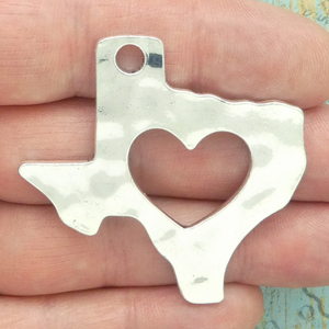 This Silver Pewter Texas Shaped Charm has a heart opening in it. Perfect size for many Texas decorating projects. Height 50-mm, Width 50-mm, Depth 3-mm. This Pewter Charm Does Not Include a Jump Ring or Split Ring.