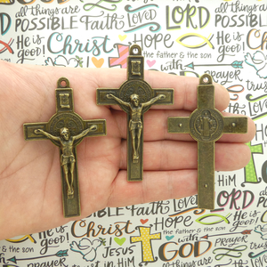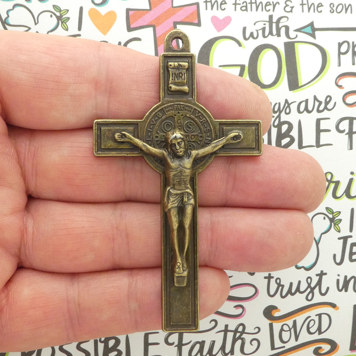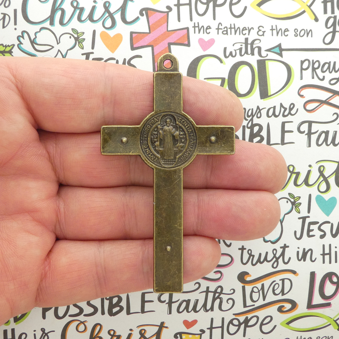 A Saint Benedict Crucifix Pendant in Bronze Pewter is a meaningful and religious accessory that can be used in various ways. Here are some suggestions on how to incorporate and use it: Keychain: Use the crucifix as a keychain by attaching it to a keyring. This way, you can carry your faith with you wherever you go. Prayer Beads or Rosary: Incorporate the crucifix as the focal point of a set of prayer beads or a rosary. The Saint Benedict Crucifix can represent the beginning or end of the prayer sequence. Home Altar or Prayer Corner: Place the crucifix on a small stand or hang it on the wall as part of a home altar or prayer corner. It can be a central focus for prayer and meditation. Bookmark: Use the Saint Benedict Crucifix as a bookmark in your Bible or prayer book. It combines functionality with a visual reminder of your faith. Remember to treat the Saint Benedict Crucifix Pendant with respect and reverence, considering its religious significance. Choose a usage that aligns with your beliefs and enhances your spiritual journey. Height 76-mm, Width 43-mm, Depth 9-mm. This Pewter Charm Does Not Include a Jump Ring or Split Ring.