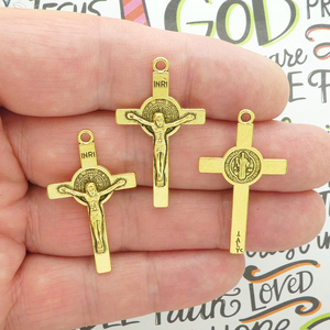 Discover the spiritual elegance of our St. Benedict Cross Pendants, available wholesale and crafted from rich gold pewter. These pendants are designed for those seeking a blend of faith, style, and tradition. Material: Made from premium gold pewter, offering a luxurious gold antique finish that resists tarnishing, ensuring lasting beauty. Design: Each pendant features the iconic St. Benedict Medal, known for its protective powers and spiritual significance. The cross design is detailed with intricate engravings, symbolizing faith, strength, and protection. Finish: The antique gold pewter finish provides a warm, inviting glow, perfect for adding a touch of sophistication to any outfit. Versatility: Ideal for both men and women, these pendants can be worn with various chain lengths or even as part of a charm collection. Their universal design makes them suitable for a wide range of personal styles and occasions. Wholesale Benefits: Offered at wholesale prices, these pendants are perfect for retailers, religious stores, or anyone looking to purchase in bulk for gifts, events, or personal collections. The St. Benedict Cross Pendant in Gold Pewter isn't just jewelry; it's a wearable testament to faith and tradition. Its durable construction and timeless design make it a cherished item for believers and collectors alike. Whether for personal use or to share with others, these pendants are a beautiful way to carry a piece of spiritual history. Height 36-mm, Width 21-mm, Depth 3-mm. This Pewter Charm Does Not Include a Jump Ring or Split Ring.