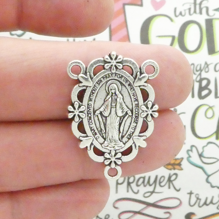 Imbue your rosary with divine beauty and spiritual significance with our exquisitely designed Miraculous Medal Rosary Centerpiece in Silver Pewter. This centerpiece is not just an accessory but a profound declaration of faith, crafted to elevate your prayer experience. Here's what makes this item truly special: Material: Forged from high-quality silver pewter, this centerpiece combines durability with a lustrous, antique finish that captures the solemnity of sacred moments. The silver hue evokes a sense of purity and peace, resonating with the spiritual essence of the miraculous medal. Design: Adorned with the iconic Miraculous Medal, this centerpiece features the Blessed Virgin Mary on one side, surrounded by the words "O Mary, conceived without sin, pray for us who have recourse to thee." The reverse side traditionally displays the Miraculous Medal, symbolizing divine love and protection. Craftsmanship: Each detail is meticulously crafted to highlight the medal's intricate imagery, ensuring that the spiritual message is as clear as it is profound. The pewter's texture and weight provide a tangible connection to tradition, making prayer a more tactile and grounded experience. Versatility: This centerpiece is designed to be compatible with any standard rosary, offering you the flexibility to incorporate it into your existing rosary or use it as a focal point for a new creation. Its universal design also makes it a thoughtful gift for those embarking on spiritual journeys. Significance: The Miraculous Medal, with its rich history and reported miracles, serves as a powerful talisman of faith. Integrating this into your rosary not only enhances its aesthetic appeal but also imbues it with additional layers of spiritual significance. This Miraculous Medal Rosary Centerpiece in Silver Pewter is more than a decorous element; it's an invitation to deepen your connection to the divine, a constant reminder of Mary's intercession, and a beautiful addition to your spiritual practices. Whether for personal use or as a cherished gift, this centerpiece promises to be a beacon of faith and hope. Height 31-mm, Width 22-mm, Depth 3-mm. This Pewter Charm Does Not Include a Jump Ring or Split Ring.