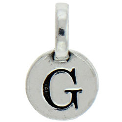 Round G Initial Charm Letter Silver Pewter with an Oxidized Finish. Height 15mm, Width 9mm, Depth 4mm. This Initial Charm Letter is Proudly Made in the USA and is Lead Free Pewter.